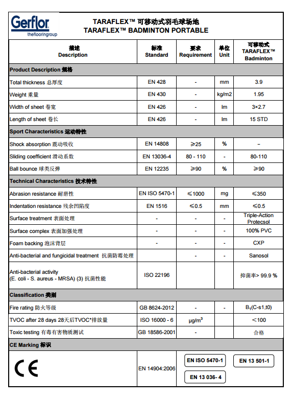 可移動(dòng)式場(chǎng)地:與法國(guó)和國(guó)際羽聯(lián)合作研制,研發(fā)**舒適性的可移動(dòng)式地面材料.Taraflex?羽毛球運(yùn)動(dòng)場(chǎng)地由3卷寬度2.7m 長(zhǎng)度 16m 的卷材組成可移動(dòng)的地板,卷材之間接縫 以維可牢連接固定。 Taraflex?羽毛球運(yùn)動(dòng)地板表面為輪壓型表層,底層是密閉式細(xì)胞泡沫背層,以雙層無(wú)紡玻璃纖維 網(wǎng)格作為加強(qiáng)材料。